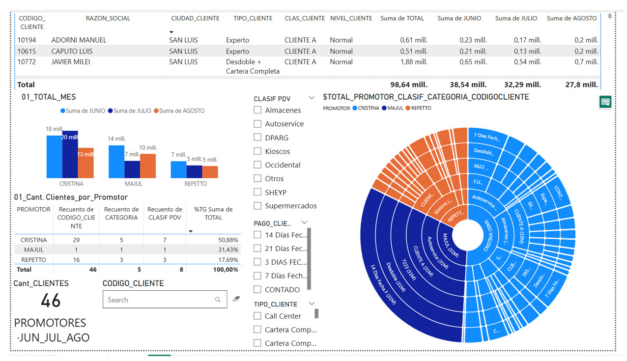 En este dashboard se integran tres meses de gestión comercial (junio, julio y agosto), analizando el rendimiento de promotores, clientes y categorías dentro del retail alimentario.